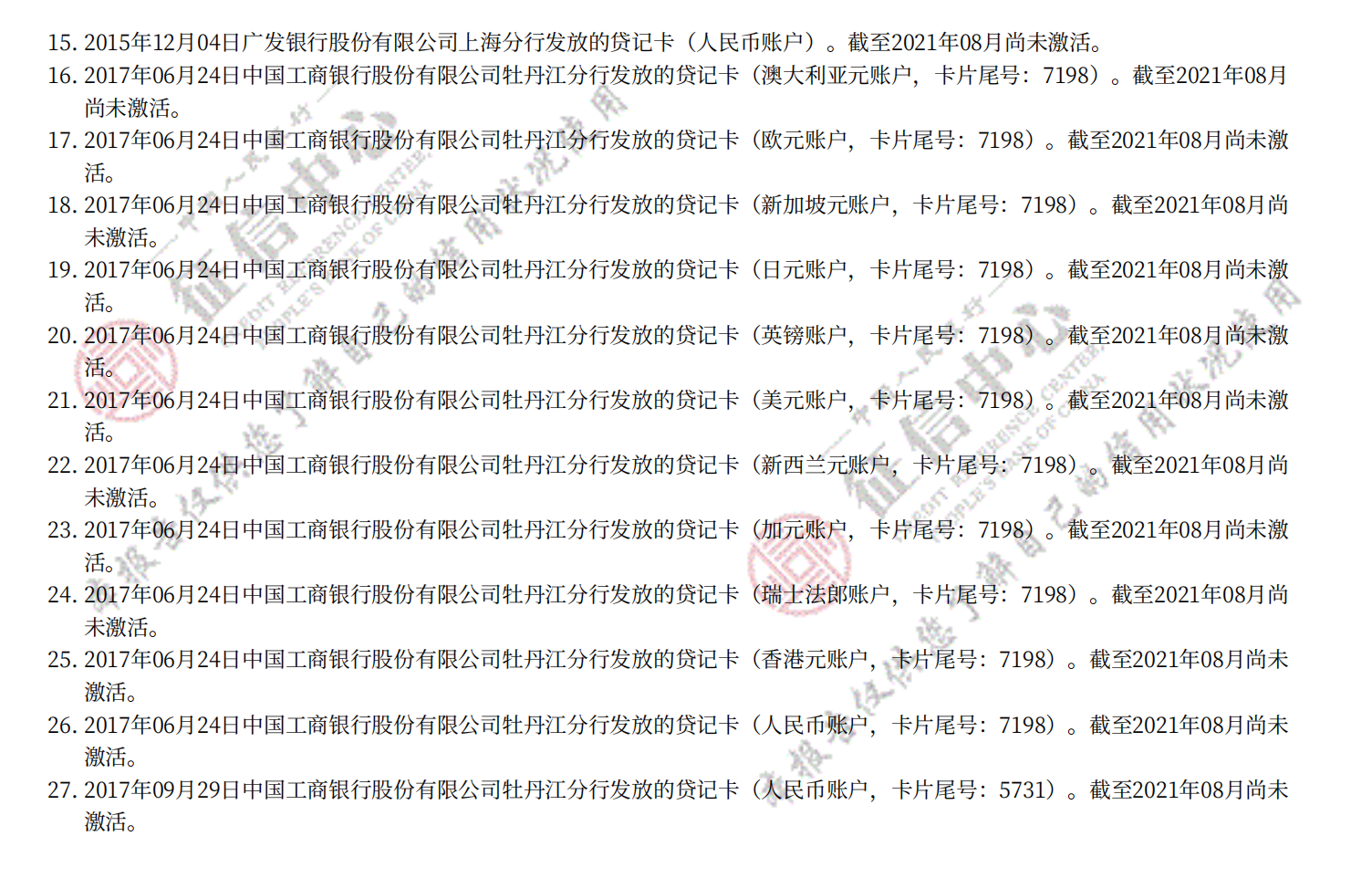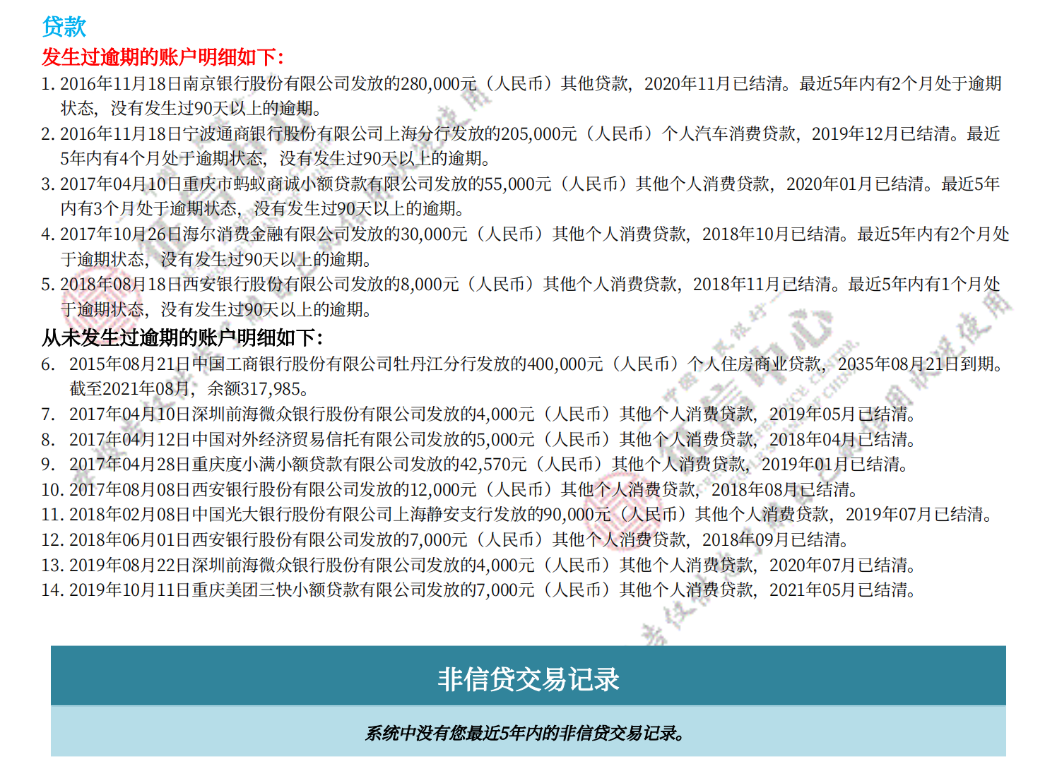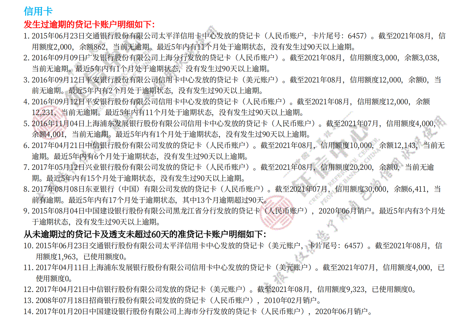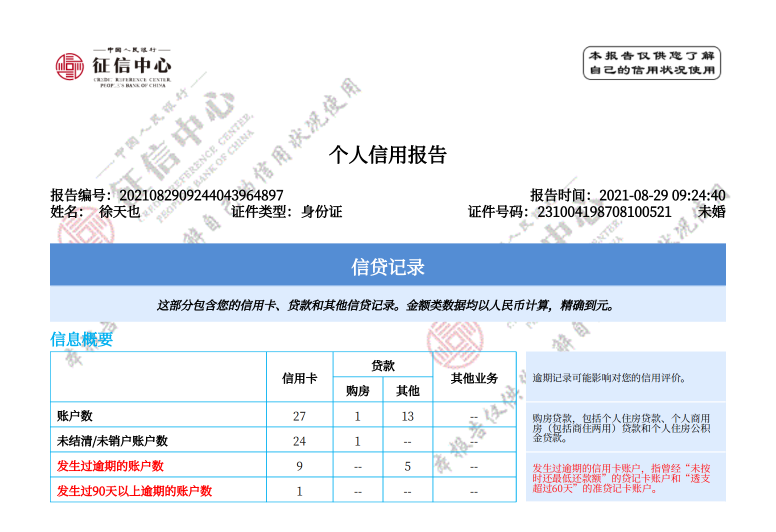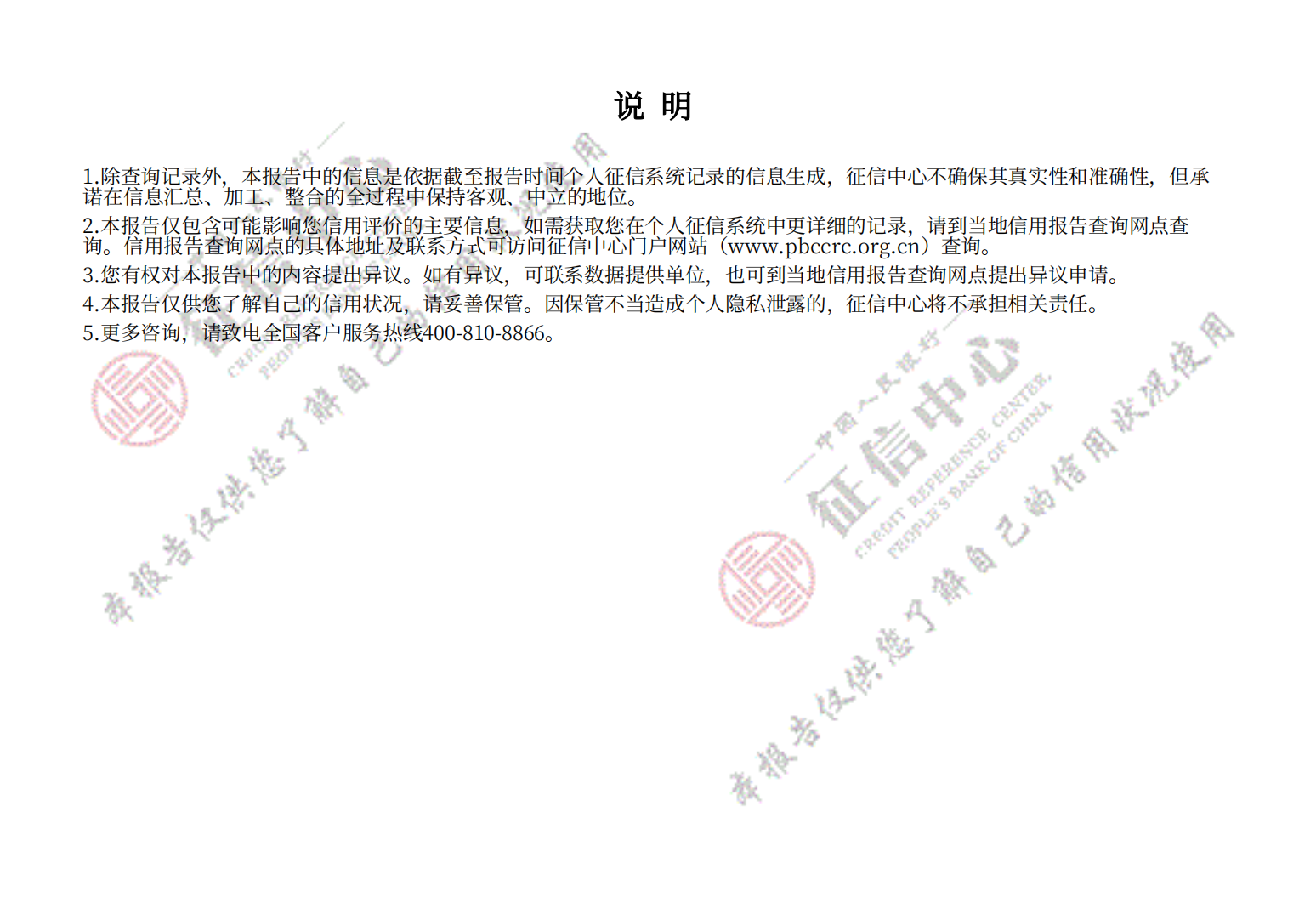 个人信用报告:根据个人的信用信息,生成个人信用报告,包括个人基本信息、信用卡使用情况、贷款记录、逾期记录等内容。